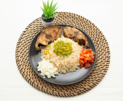 Notre Garba est accompagné de poissons de qualité supérieure frit à l’huile de palme Bio.